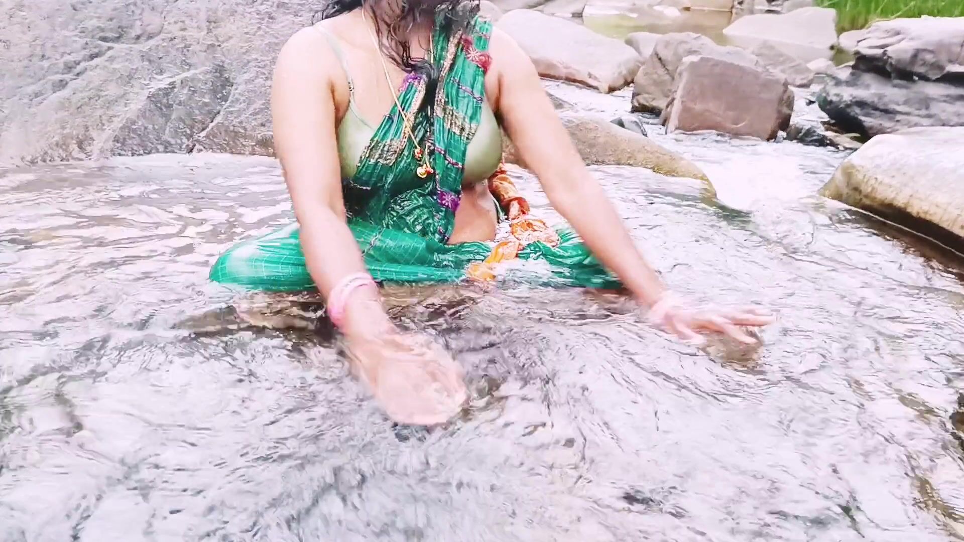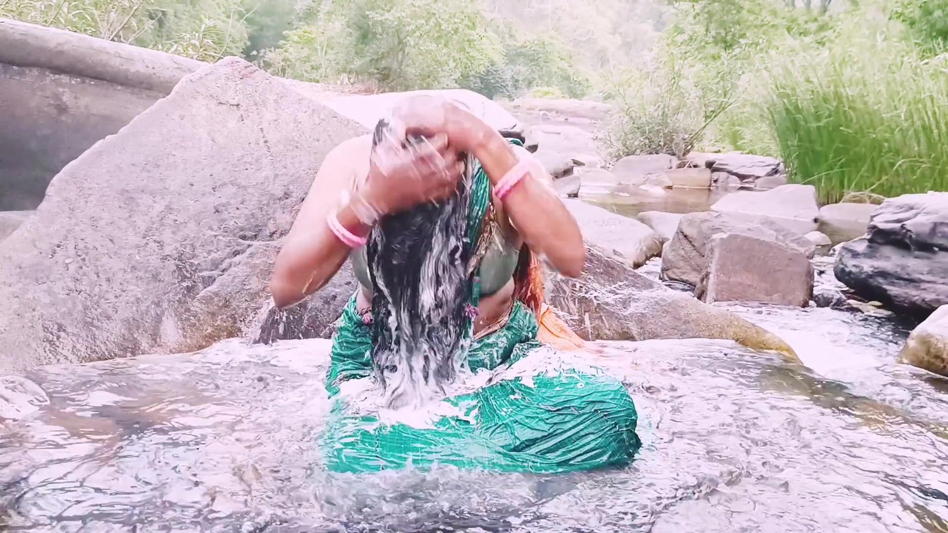 . Telugu sexy Silk aunty outdoor waterfall bathing, telugu Dirty talks.
